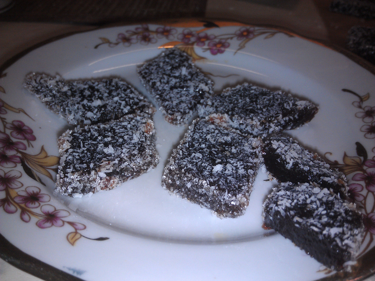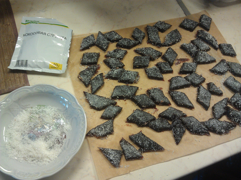 Потом все это дело вылила я на противень с пергаментной бумагой и стала сушить. Сутки сушила на одной стороне и еще сутки на другой. Потом порезала и обваляла в сахаре и кокосовой стружке.