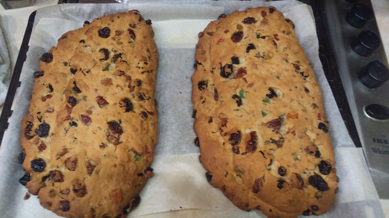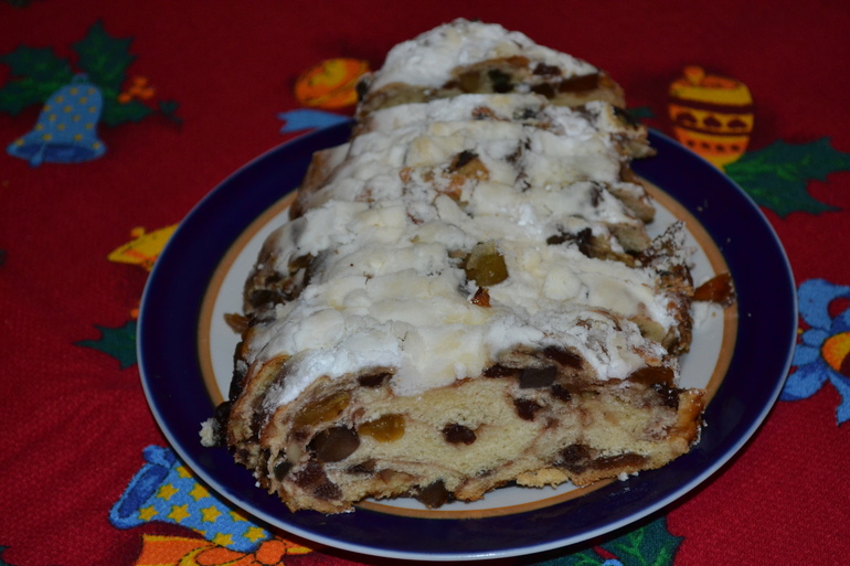 Сегодня я делала полторы порции из них вышло 2 штоллена, один пекла на противне(он на фото), второй в форме.