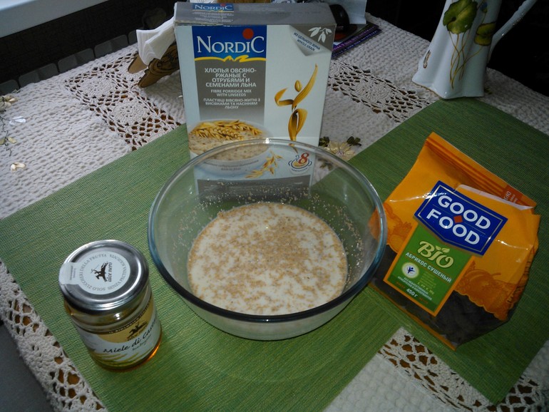 Хлопья залить молоком и водой и оставить для набухания на 30 минут.