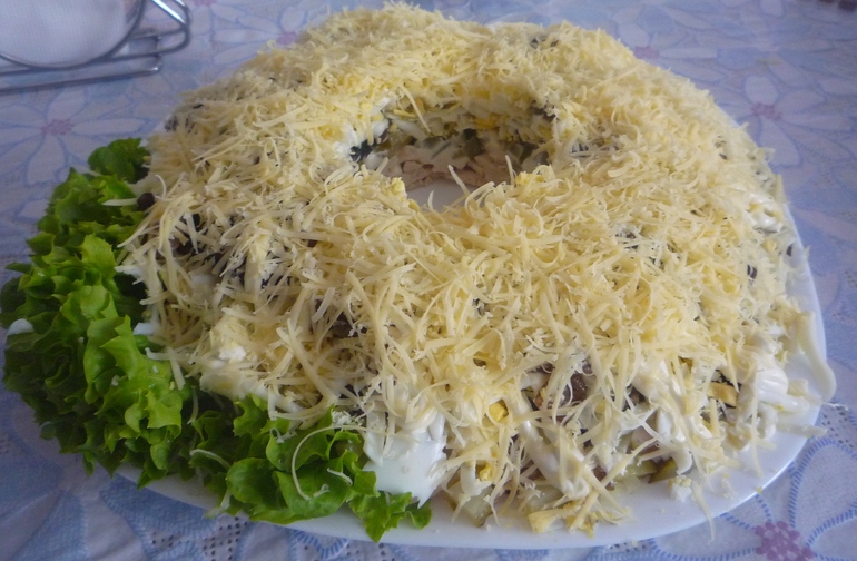 - свежие шампиньоны обжаренные с луком+ майонез- 3 слой;