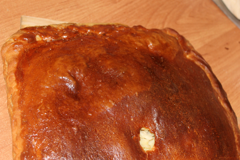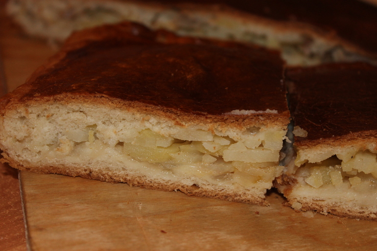 Начинка свинина(маленькими кусочками), картошка тонкой соломкой, все смешала в чашке - посолила, поперчила, на дно выложила лук полукольцами, а потом картошку+мясо (можно и капусту тушеную+яйцо, либо рис + рыбу консервированную, типа сайры, наверное, или скумбрии) на картошку положила кусочки масла сливочного, пирог накрыла слоем теста, смазала яйцом, выпекала минут 50 при 180 гр.