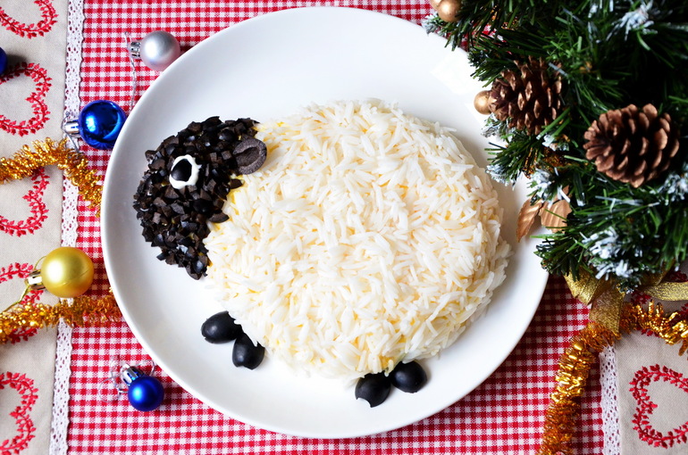 Нашу милую овечку мы приготовим из простых продуктов. Возьмем крабовые палочки, отварные яйца, консервированную кукурузу, свежие огурцы и майонез. А для украшения нам потребуется длиннозернистый рис и черные оливки.В первую очередь отвариваем рис. Рис желательно взять длиннозернистый. Такой рис после отваривания остается рассыпчатым (главное его не переварить). Для начала тщательно его промываем до чистой воды. Чистый рис высыпаем в кастрюлю и заливаем холодной водой. Воды берем в два раза больше от количества риса. Ставим на огонь и варим рис до готовности.Пока варится рис займемся другими ингредиентами. Крабовые палочки натираем на крупной терке (в таком виде их будет проще выложить в ровный слой).Свежие огурчики очищаем от шкурки. Нарезаем их тонкой соломкой (натирать на терке не советую).Отварные яйца очищаем и также натираем на крупной терке.