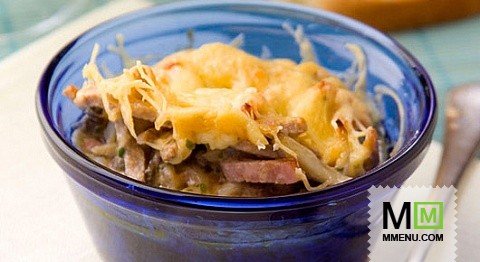 Приготовленную массу уложите в кокотницы, посыпьте тертым сыром и запекайте при 220°С до образования золотистой корочки.