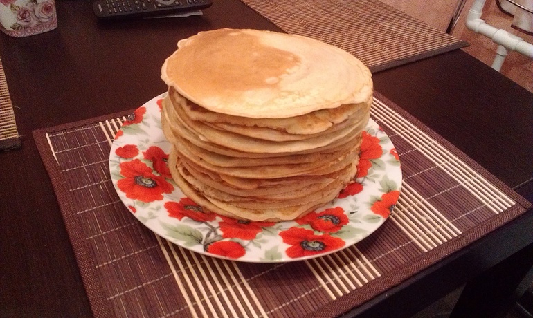 Поэтому после свадьбы я стала искать "свой" вариант рецепта. Перепробовала несколько, но всё было "не то". И вот, на первую супружескую Масленницу, я спросила у коллег разные варианты приготовления блинов. В итоге, доверилась своему вкусу при выборе из них: в душу запал рецепт сверкови моей коллеги (точного рецепта она не знала, но объяснила принцип, а там уже я его довела до ума). С тех пор только так и готовлю. Вот, вчера на ужин напеклось (сейчас ими же обедаю, и решила с вами поделиться рецептом). Получаются оч вкусные, плотненькие и нежные блинчики