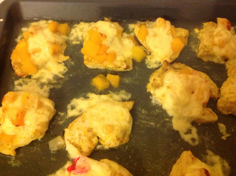 Куриные грудки нарезаем на кусочки, у меня из целой грудки получается 8 шт. Я делаю сразу две, съедается моментально. Кусочки филе солим, перчим, добавляем карри чуть меньше 1 ст.л., майонез 2-3 ст.л., перемешиваем и оставляем можно на ночь можно и часа на 3. Хорошо разогреваем духовку до 180 градусов. Противень чуть-чуть смазываем маслом, выкладываем филенки и сверху на каждый кладем пол кольца консервированного ананаса, у меня была смесь фруктов, получилось тоже очень вкусно. Ставим все в духовку, через 10 минут сверху кладем брусочек сыра( брусочек что бы плавился подольше) еще через 10 минут готово!! У меня было готово уже через 15, но духовка должна быть горячая! Эту курицу важно не передержать!!! Очень необычное сочетание соленого сладкого и карри.