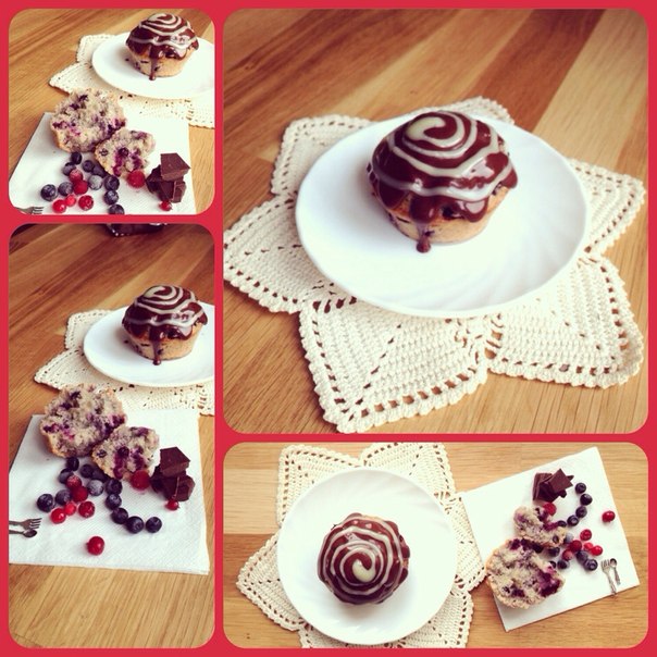 Смешиваем сухие и жидкие продукты отдельно. Соединяем все вместе и добавляем ягодки. Вот здесь у меня получился казус, высыпала замороженные ягоды - в дверь постучали. когда вернулась к тесту они подтаяли, поэтому тесто получилось магического сереневого цвета(будьте бдительны), но вкус это не испортило. Выпекаем в формах при 180 гр ок 30 минут. ОООчень вкусная нежная текстура..Это надо делать и пробовать. Приятного аппетита!