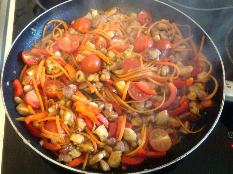 Не могу рецепт вставить, напишу тут Курочку режем на небольшие кусочки, обжариваем на сильном огне до золотистой корочки, добавляем немного соуса терияки, карамелизуем, убавляем огонь, добавляем овощи, еще соуса, томим овощи. В это же время варим лапшу. И добавляем ее к курице и овощам, можно добавить еще соуса терияки или соевового и в конце кунжут. Получается очень вкусно!!