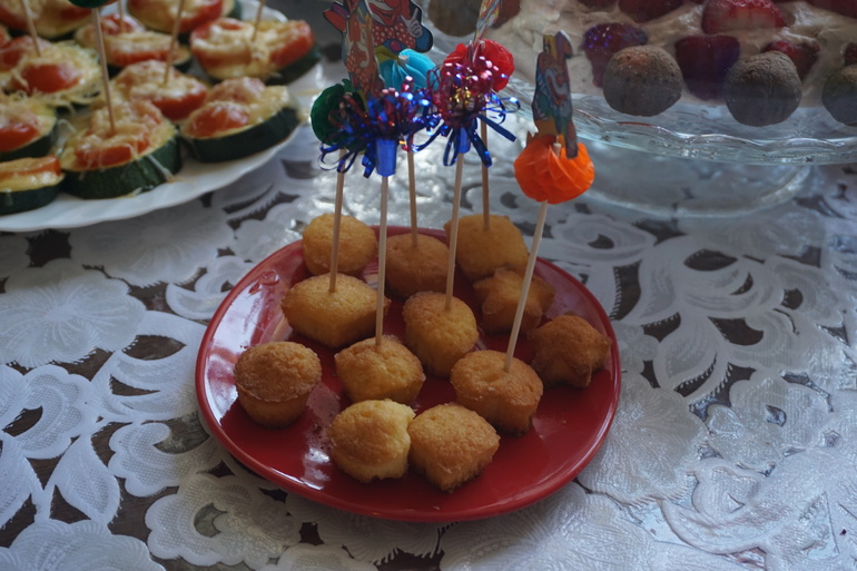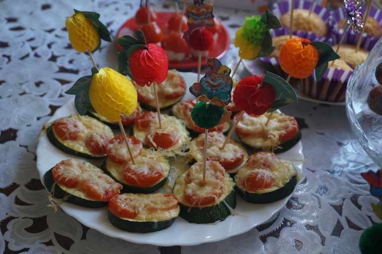 Пыхтела я до 5 утра, хотя блюда очень простые, это я тормоз видимо. Уложили ребенка спать, стали украшать. Повесили растяжку, надули шарики (баллон с гелием покупали), к утру половина шариков сдулась т.к. мы не знали, что есть чудо средство, которое брызгаешь в шарик перед надутием и он долго будет летать, ну да ладно, фольгированные все держатся и то хорошо) Развесили бумажные украшения, в общем принарядили квартиру. И приступила я к готовке. На взрослых не рассчитывала, потому как никого не звала. Должны были приехать мои подруги с детьми Алисиного возраста, поэтому целью было приготовить угощение для малявок. Вот что у меня получилось.