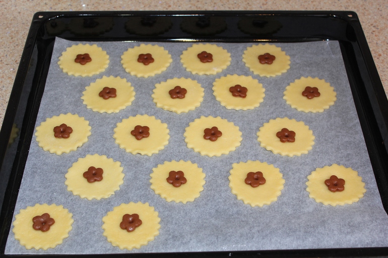 Тесто раскатать в пласт толщиной 5 - 7 мм. Выемками вырезать печенье любой формы.