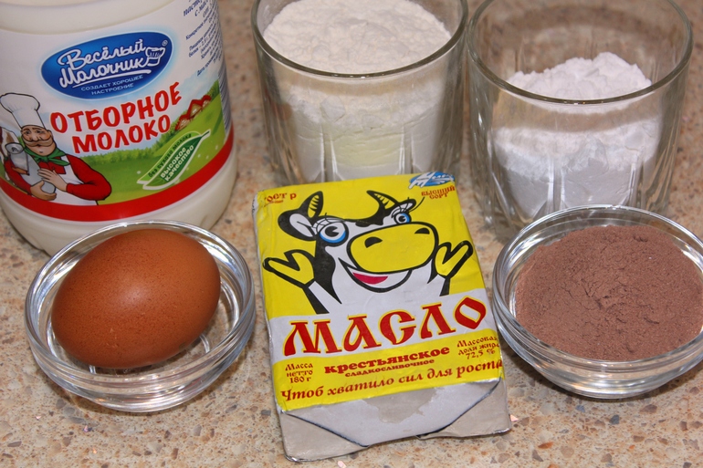 Для теста: 100 гр. сливочного масла, 0.5 стакана сахарной пудры, 1 яйцо, 3 ложки молока, 2.5 стакана муки, 2 - 3 ст. ложки какао порошка