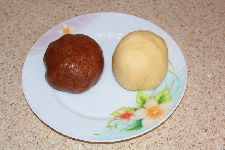 Разделить тесто на две части. Одну часть смешать с 2-3 ложками порошка какао