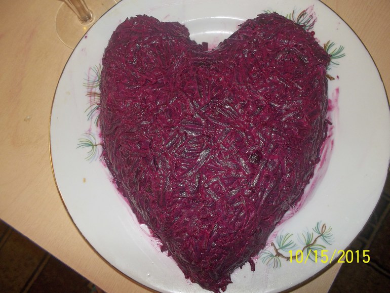 Салат можно выложить в форме сердечка или горкой, но поскольку салат носит игривое название, я решила в качестве шутки выложить вот так: