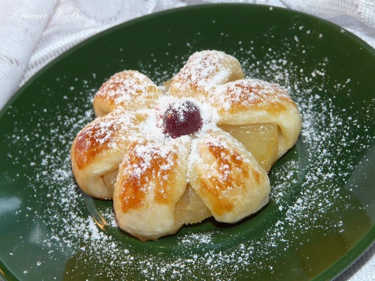 Тесто раскатать и нарезать длинными полосками. С ананасов слить жидкость и обсушить на салфетке. Обернуть полоской теста колечко ананаса. Выложить "ромашки" на смазанный растительным маслом противень и смазать взбитым яичным желтком, а в серединку положить ягодку. Получившиеся "ромашки" поставить в заранее разогретую духовку и выпекать при 180С примерно15-20 минут, до готовности теста. Готовые "ромашки" посыпать сахарной пудрой. Приятного чаепития!!!!