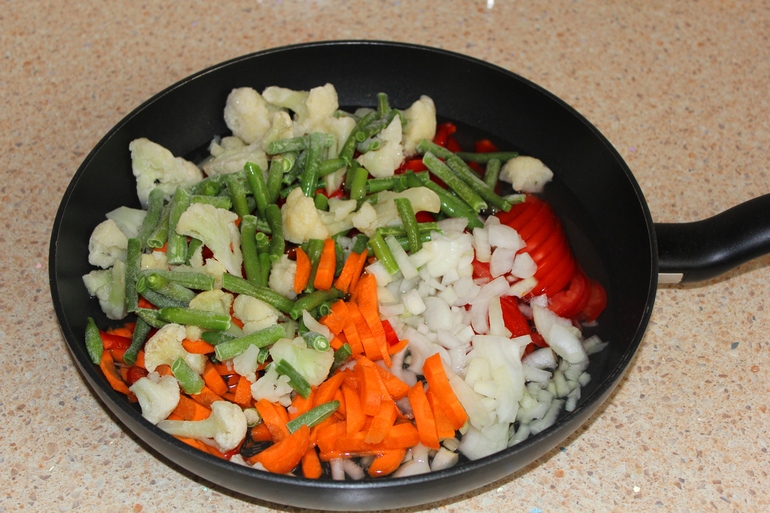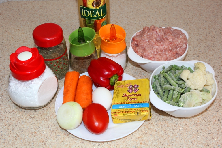 Цветная капуста и стручковая фасоль (заморозка), лук репчатый, помидоры, болгарский перец, морковь, пряная сушеная зелень (укроп, петрушка, базилик, сельдерей), соль, черный молотый перец, масло растительное, панировочные сухари или манка для подпыла формы для запекания