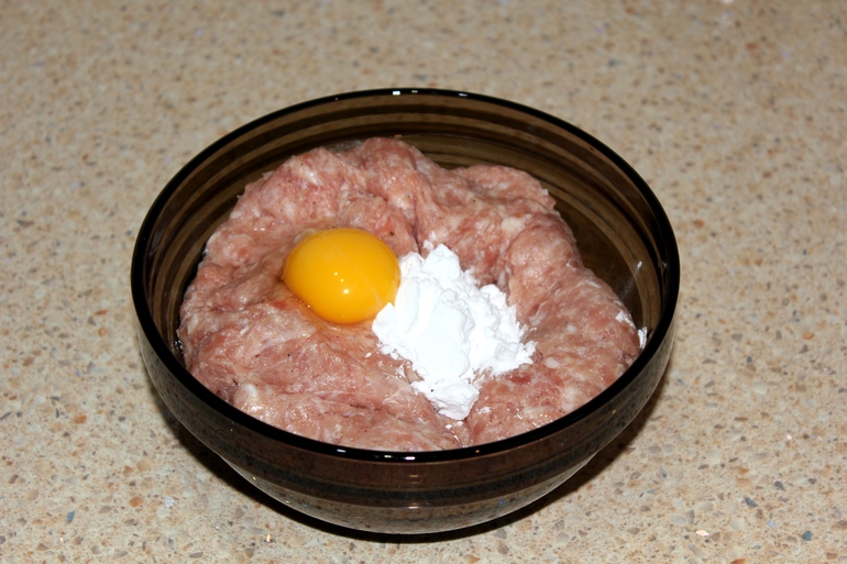 Фарш любой (я использовала не жирную свинину), 1 ст. ложка крахмала, 2 яичных желтка, соль, перец по вкусу (ингредиенты рассчитаны приблизительно на 1 кг. мясного фарша).