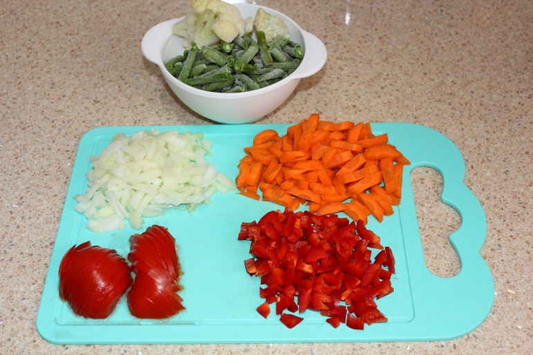 Лук, болгарский перец порезать кубиками, морковь брусочками, помидоры соломкой