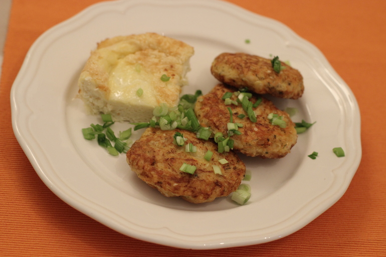И вот остался у меня этот один кусок филе, я его посолила, поперчила и в пакет в холодильник. Во вторник измельчила в блендере, добавила соль, смесь перцев, хмели-сунели, красный сладкий перец, сушеный укроп. Порубила мелко-мелко половину луковицы, на средней терке 1 морковь, на средней терке кабачок, немного муки и фарш готов! Слепила руками шарики, сплюснула и на сковороду, на небольшом огне с двух сторон. Готовятся очень быстро, получились ароматными и сочными!