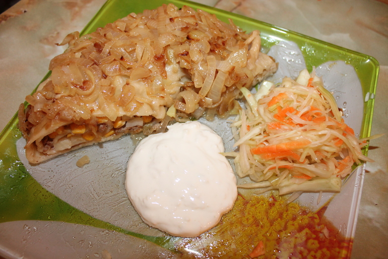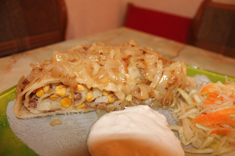 Тонко раскатываем тесто, выкладываем мясной фарш, на него -овощной (картофель порезала мелким кубиком)
