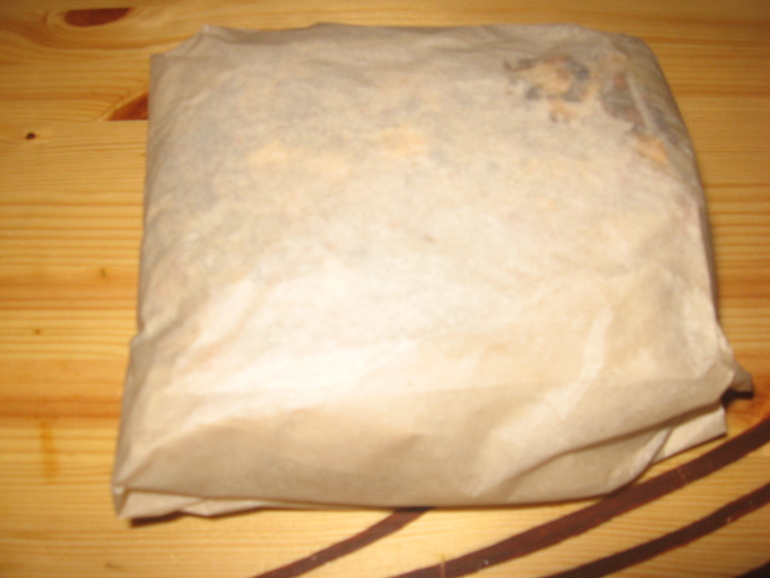 Заворачиваем плотно в пленку или пекарскую бумагу, прижимая верхний слой специй к мясу.