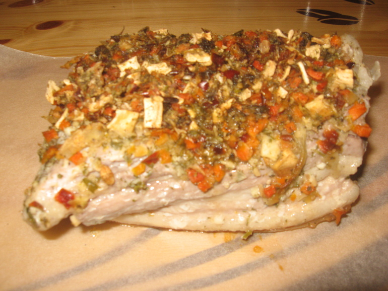 Пропустить через пресс чеснок, добавить молотый черный перец, и 2 столовых ложки смеси кореньев и трав.