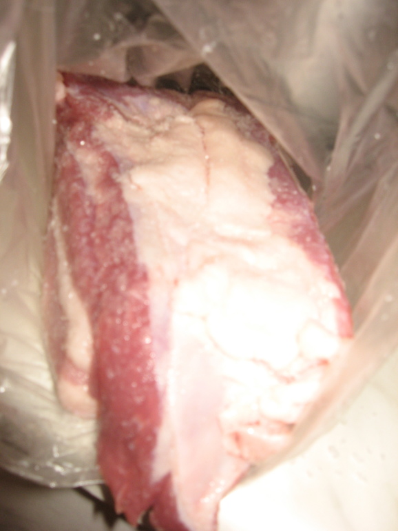 Грудинку обсушить, натереть солью. Уложить в пакет, туго завязать, воздух не выпускать, и оставить на 5 дней в холодильнике.