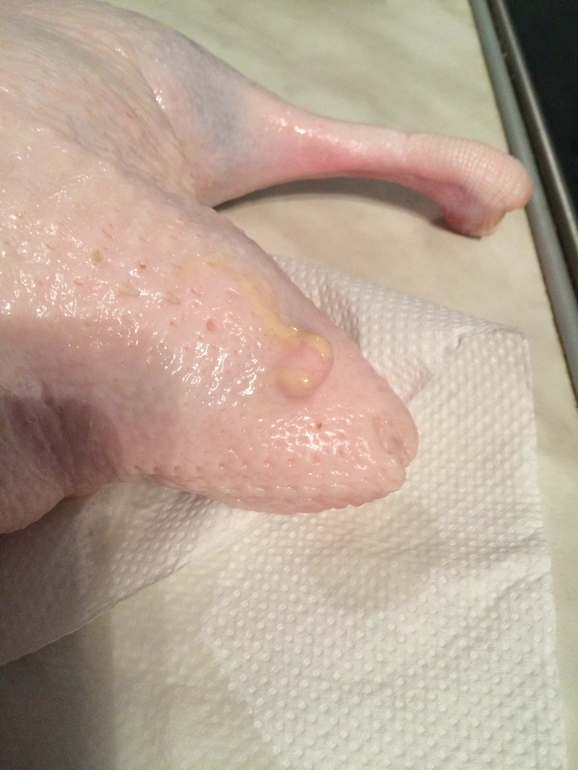 Это гузка, жёлтое это смазка для перьев. Гузку как правило отрезают, ну или вырезают эту штуку с жиром.