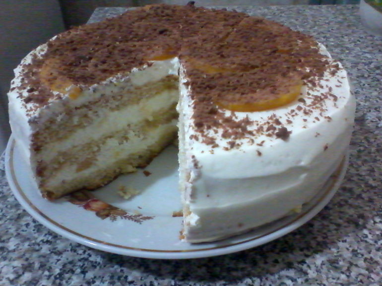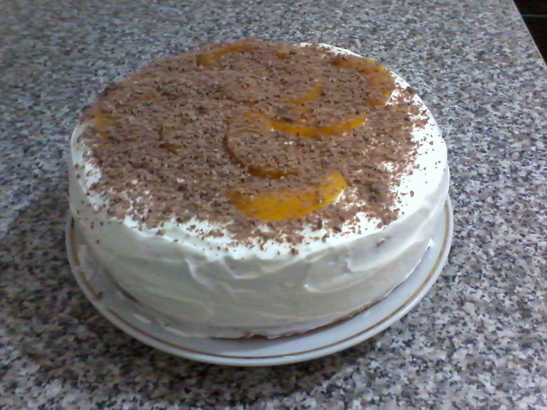 Печенья, пирожные, торты, пончики, кексыИспекла бисквит. Чуть-чуть накосячила - попали желтки и белки плоховато взбились. Разрезала на три коржа. Крем сделала из сметаны и ванильных сырков, сахарной пудры. Коржи пропитала сиропом от персиков, а кусочки персиков вдавила в крем. Украшатель из меня так себе:-)