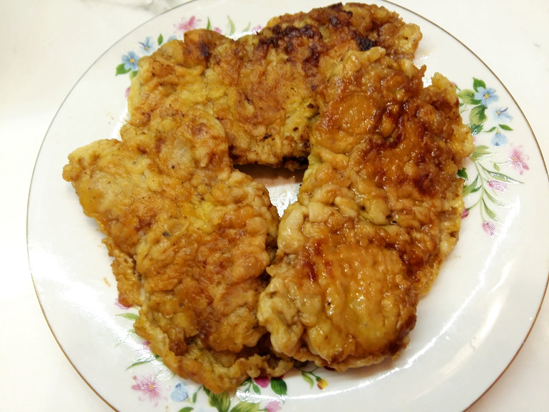 На сковородку наливаем масло и хорошо нагреваем. Каждый кусочек мяса сначала обмакиваем во взбитое яйцо, затем панируем в муке, потом еще раз - в яйцо и снова в муку. Жарим на среднем огне.