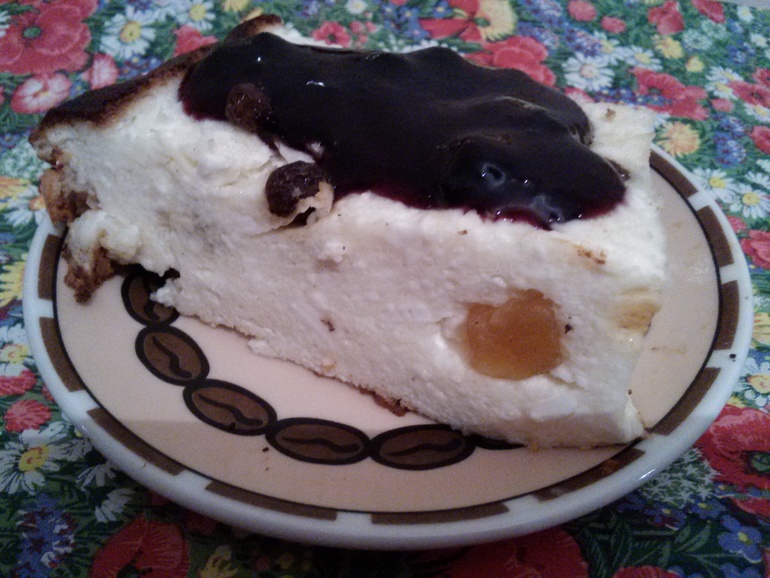 С удовольствием:-) Смешать 3 ст ложки манки с 5 ложками столовыми сметаны. Оставить на ночь. Утром добавить 500 грамм творога (у меня было 300 деревенского и 200 нулевого мягкого), 3 яйца, треть стакана сахара (так как планируется топинг и наполнители). Хорошо взбить миксером. Добавить цукаты и \ или изюм. Перемешать. Выложить в форму. Смазать двумя ложками сметаны, поставить на 180 градусов в духовку, накрыть как зарумянится бумагой. (Если этого не сделать придется отслоившуюся "крышку снять,как я :-)) Печь до сухой лучины:-) Подавать с джемом,сметаной или сахарной пудрой и свежими фруктами:-)