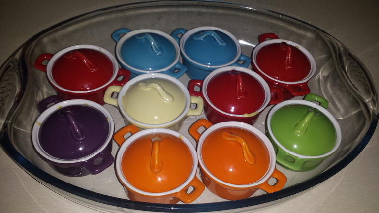 Вот такую красоту мне подарили. Кастрюлечки малюсенькие, буквально четверть стакана объемом но очень красивые и яркие и подавать в них еду очень приятно. Вот теперь думаю, что кроме жульена можно интересного в них запечь. Может у кого есть идеи?
