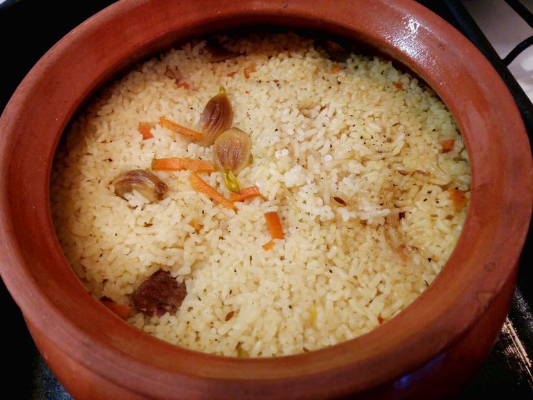 Берем горшочек и в него перекладываем мясо с овощами, чуть-чуть соли. Промываем рис и равномерно выкладываем на мясо. Добавляем остатки специй и чуток соли. Чистим чеснок и втыкаем дольки в рис. Заливаем кипятком так, что вода покрывала на 1,5 см. рис.