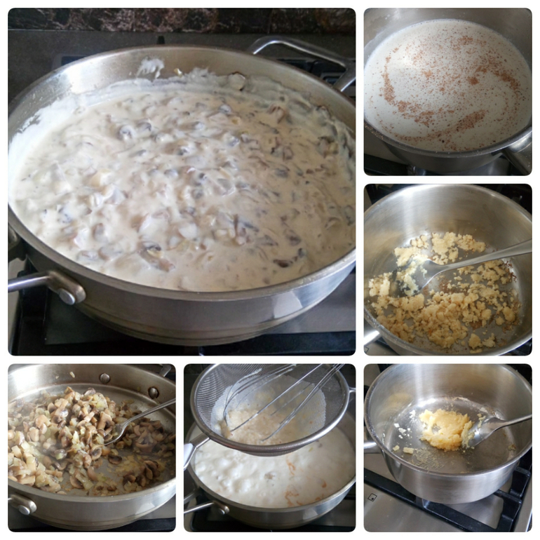 В нержавеющей кастрюльке на медленном огне на масле поджарить муку до золотистого цвета, все время помешивая лопаткой . Получается такой комок. Влить сливки, и помешивая венчиком, довести до кипения и сразу отключить. Будут комочки. В обжаренные с луком грибы (посолить) на сковороде , выливаем эту смесь, процеживая (протирая) через металлическое сито. Только осталось разложить в тарталетки, посыпать сыром и запечь.