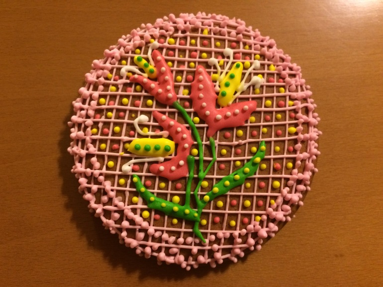Рецепт: мёд 100 гр. сахар 100 гр. 1 яйцо, рафинированное масло 50 гр. 250 гр муки.1/2 кофейной ложки соды, специи:анис, кардамон, имбирь, мускатный орех, корица, черный перец. Смешать мёд, сахар, яйцо, соду. Добавить масло, специи и муку и замесить тесто. Положить на сутки в холодильник. Раскатать 5-6 мм, вырезать формочками фигурки, осторожно воткнуть длинную зубочистку, если хотите сделать цветы. Пряники остудить, дать полежать часа 3-4 и только потом расписывать. У меня айсинг порошковый готовый, в интернете много рецептов о домашнем приготовлении айсинга из белка. Я делала из перепелиных яиц ( боюсь сальмонеллеза), геморрой ещё тот. Лучше купить готовую смесь или сухой яичный белок и смешать с сахарной пудрой.