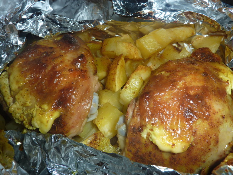 картошку кусочками режем. кладем на фольгу (я беру в 2-3 слоя толстую)
