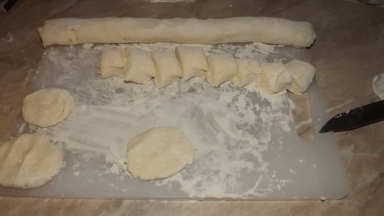 На стол насыпаете муку, выкладываете тесто и начинаете его слегка катать по муке, делая "полено", затем, когда все тесто стало обсыпано мукой, катаете жгут, диаметром 2 см.