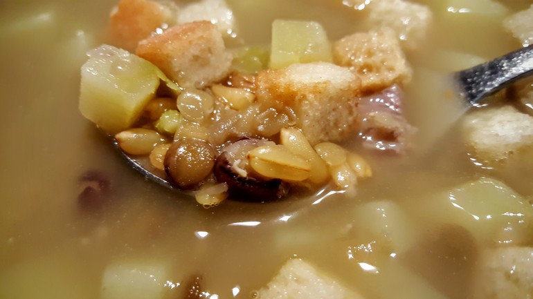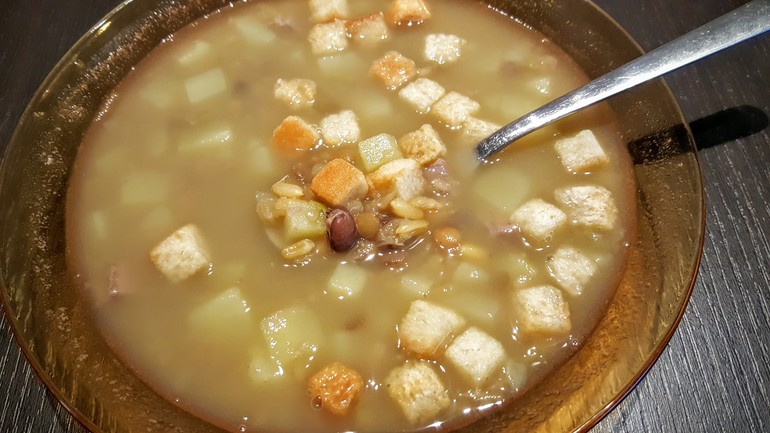 Промыла и залила тёплой водой 200гр смеси. Оставила на часок. Потом слила воду, добавила кусок мяса с косточкой, головку лука, лавровый лист, соль, перец и свежей воды 1,5 литра. Вскипятила и оставила на медленном огне на 1,5 часа. Добавила мелко нарезанной картошки и немного зелени (укроп и петрушка). Потомила ещё с полчасика. Суп получился густой, почти суп-пюре, очень ароматный и вкусный! Всем советую))