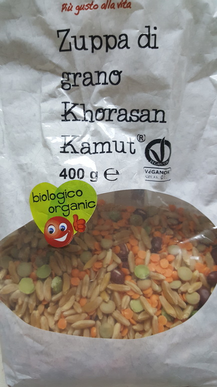Пользуясь командировкой мужа (он не любитель супов), решила я побаловать себя и дочек новым блюдом. А началось все с того, что я увидела эту смесь в магазине (камут, чечевица красная и зелёная, горох и фасоль)