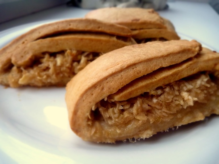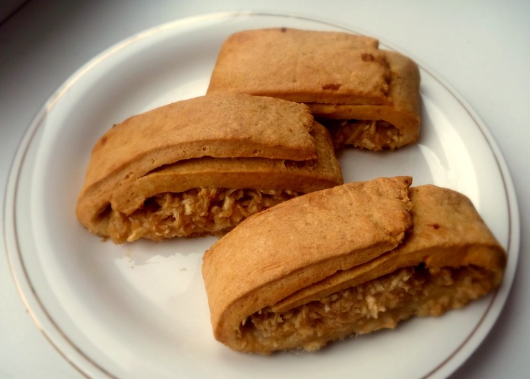 Подворачиваем края теста внахлест друг на друга. Ножом разрезаем получившийся рулет на порционные кусочки.
