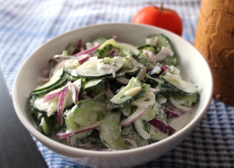 Огурцы нарезать тонкими кольцами. Красный лук нарезать полукольцами. Смешать сметану, сахар, соль, укроп, перец и бальзамический уксус. Огурцы и лук выложить в емкость, заправить соусом, перемешать и убрать в холодильник на 30 минут.