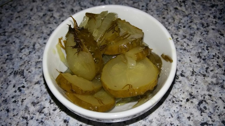 Ингредиенты: 2 кг. огурцов, 250 грамм лука, большой пучок укропа, 1,5 ст.л. соли, 3 ст.л. сахара, 8 ст.л. 9% уксуса, 12 ст.л. растительного масла