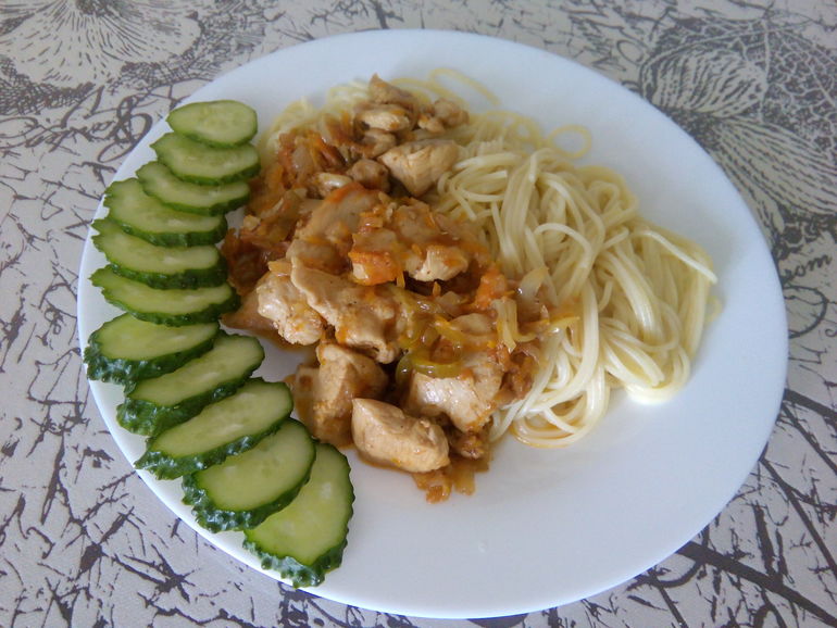 За основу взяла рецепт дикого мяса от Анастасии,но чуть - чуть изменила процесс приготовления. Соломкой нарезала и обжарила лук, перец, к ним морковь на мелкой (захотелось так 😀) терке, помидоры кубиками без шкурки. Все потушила почти до готовности. Затем обжарила куриную грудку до золотистой корочки. К курице добавила овощи и залила соусом из соевого соуса, воды, приправы для корейской моркови, паприки и чеснока. Потушила еще буквально 5 минут, чтобы курочка сочнаой осталась. Оочень вкусно! Быстро!