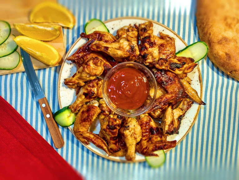 Решили побаловаться куриными крылышками в крутом маринаде из квасного сусла, меда и ткемали. Сусло в маринаде дает приятную терпкую ноту блюду. А апельсин, мед, ткемали и специи добавляют пряности. В целом блюдо получается невероятно ароматным, а мясо нежным!