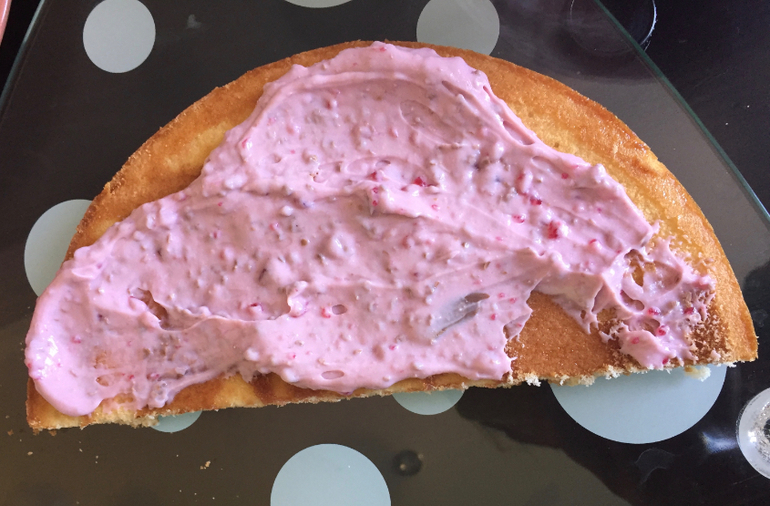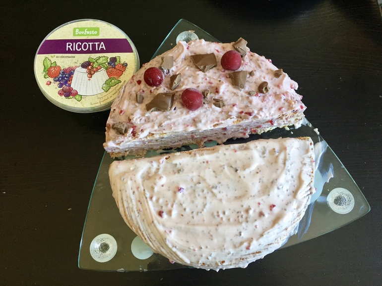 1) Коржи покупные. Крем из Рикотты+вишневое варенье+шоколадная крошка