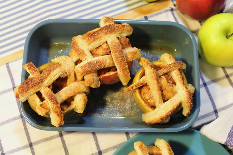 Сегодня у нас очень простой в приготовлении и в то же время вкусный и ароматный десерт: запечённое яблоко с начинкой из мякоти, смешанной с корицей и медом, и покрытое сверху сеточкой из слоеного теста. Отличный быстрый десерт для холодного промозглого осеннего вечера.