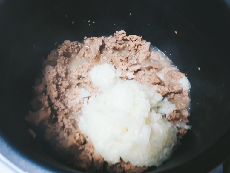 Сливаем воду с фарша, если она есть. В идеале - она выкипит. Добавляем растительное масло, лук, соль и черный перец и жарим ее 5-7 минут.