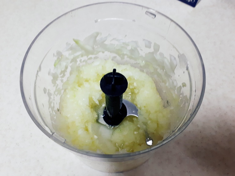 В это время измельчаем в блендере лук. Таким образом блюдо выйдет намного сочнее и ароматнее, плюс не будет явных кусочков лука, сочетание которых с макаронами не всем по вкусу.