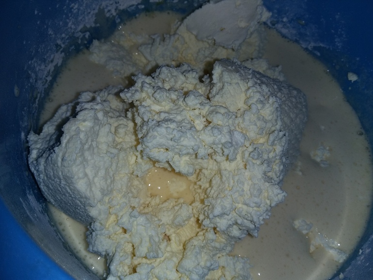 Добавить 500 г творога (я делала свой из молока и кефира и получилось 700 г):