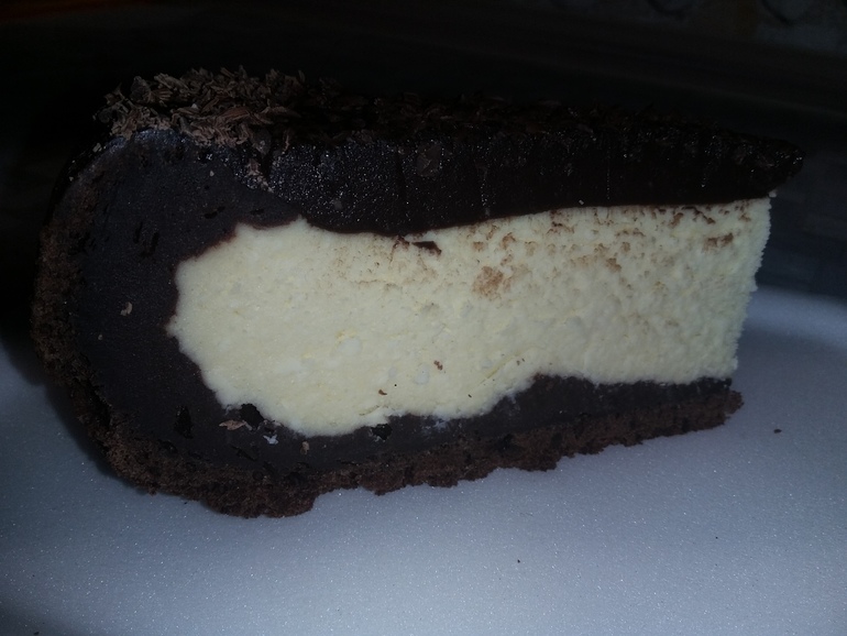 Вылить аккуратно творожную массу на шоколадное тесто, не доходя до краев (у меня в оном месте все же перелилось). Шоколадное тесто поднимается, образуя бортики: