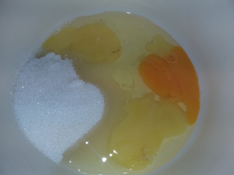 В чашу миксера положить 2 яйца, 150 г сахара, ванилин: