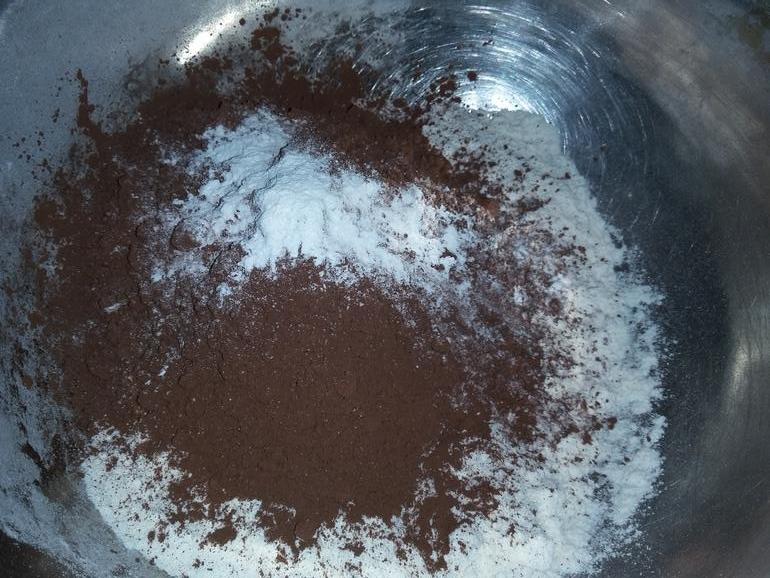 Смешать 160 г муки, 2 ст.л. какао, 0,5 ч.л. разрыхлителя: